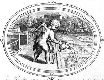 アモルが弓を杖にして腰をかがめながら、庭園の若草にジョウロで水をていねいにあげている。この庭の左側には入り口があり、ここが<囲われた庭>(愛の象徴)であることがわかる。