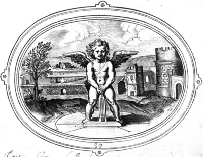 アモルが六等分された石の上で、閉じた測鉛具を握って立っている。アモルのはるか背後には、倒れたオベリスク、石塔、石壁が散在し、測鉛具をきちんと利用しなかった場合に起こること、すなわち自分の恋人との関係でその道に外れるようなことをすれば、愛が壊れてしまうことを教えている。
