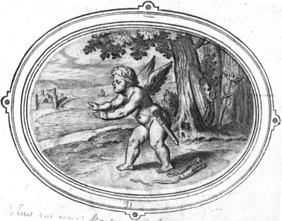 目が見えないアモルが両手を前に出しながら進もうとしている。アモルの背後の樹木には、見たものを石化させる怪物ゴルゴンの図がついた盾が立てかけられている。またその隣には、人の導き手であるメルクリウス神の持物であるカードゥーケウス(蛇杖)が立てかけられている。