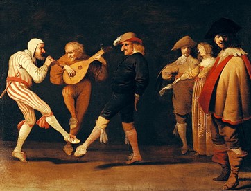 笛とリュートを奏でる役者たちが踊り、また仮面を付けた役者がその音楽に合わせてそろって踊っている。仮面はイタリアの即興喜劇を彷彿とさせるが、喜劇に登場するインアマラート(恋する男)は仮面を付けない。とすると、役者の斜め後ろにいる男性と女性のカップルが、恋する男と女(インアマラータ)の役を演じるのだろうか。喜劇の骨頂は、めまぐるしく変わる恋の状況でピカレスク的な戦略をこらし見事に恋を成就させる展開にあるが、私たちを見つめる画面右手前の男性はそんな喜劇的愚行を突き放すような笑い方をしている。