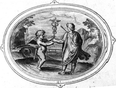 アモルが、トーガ(ローマ市民が着用した服)姿のメリクリウス神から道ばたで杖を手渡されている。この杖が重いのか、アモルは落とすまいと両手でしっかり握っている。メルクリウス神の胸にはアモルの矢が刺さり、この神が授ける修辞の力は、たんに人を動かす説得力ではなく、恋人の心をも動かす力を持つことも暗示している。