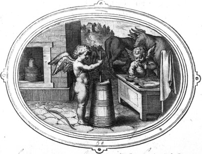 一番手前では、アモルが樽のなかの乳を練っている。テーブルでは別なアモルが丸皿に盛りつけをしている。一番後ろでは、乳牛からアモルが乳を搾っている。チーズ造りの場面だとすると、搾った乳に、テーブルの上でスターター(乳の発酵をスタートさせる乳酸菌やカビ)を注ぎ、それを樽に入れてレンネット(乳の凝固をさせるために添加物)とともに攪拌し、凝乳を造っていることになる。背景左に見えるのは、凝乳を重石の下に置いて、チーズとして固めている場面。