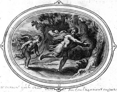 アモルの矢で胸を射られた男が、アモルに追いかけられ、不安にかられ捕まるまいと走って逃げている。アモルは笑い顔で悠々と、このあわてる男を追っている。