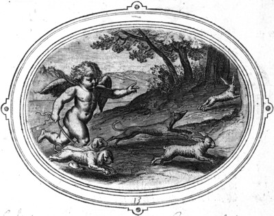 典拠不記載:フィロストラトス「アモルたちは、ウサギを弓矢で射たりすることはないが、それは[母である]ウェヌス女神が捧げ物としてもっとも好まれるのが生き身のウサギなので、生きたまま捕まえようとするからだ。」(『絵画論』「アモルたち」1巻6章[➽5番])。