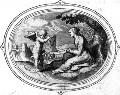 身なりも正しく、髪をきちんと編んだ女性が木陰に座っている。その女性が身を少しかがめてじっと見つめているのは、二本の矢でX字型(紋章学用語で<サルティア> saltire)に射抜かれた心臓というエンブレムである。アモルが差し出す巻紙に描かれているこのエンブレムは、愛の独自の掟(言葉よりも真意)を教えている。なお17番の図絵と同様に、女性が腰かける樹木は楡で、そこにからまるのはツタで、このペアは結婚・結婚愛を象徴している。
