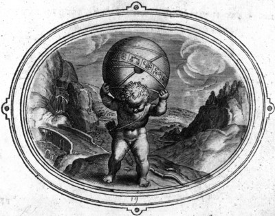 アトラース:ユッピテル神に反乱する巨人族[➽フェーン氏への賛辞]に加わったかどで、天球を支える罰を科せられた(ヘーシオドス✒『神統記』517-520行)。天球を支えていたアトラースにヘルクレースは会うと、天球を支える代わりにヘスペリデスの園のリンゴを奪ってもらう。