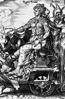 凱車に乗って進む金の女王 (フィリップ・ハレ (Philip Galle) [1563]銅版画 ワシントン・ナショナル・ギャラリー 蔵))
