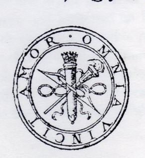 17世紀西欧の本の表紙には、出版者名だけでなくその社章がしばしば印刷されている。ここでは、フェーンの工房による自社出版のために、フェーンが考案した<アモルの社章>が付いている。中央部分は、アモルの持物である弓、矢筒、弓矢、松明からなり、それらが矢筒についた紐でまとめられている。この意匠の周囲にはラテン語で「愛はすべてを征服する」AMOR OMNIA VINCIT とある。