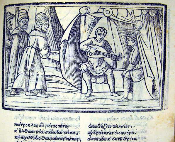ニコリーニ・ダ・サッビオ (Nicolini da Sabbio)「竪琴を弾くアキレース」(ホメーロス『イーリアス』挿絵入りギリシア語版, ヴェネチア:1640年)