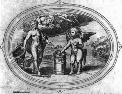 アモルが左手を胸にあて、開いた本の上に右手を置きながら、宣誓の仕草をしている。アモルが見つめているのは、愛の女神ウェヌスで、女神は微笑みながら本を指さしている。、ウェヌスの凱車(がいしゃ)を曳くはずの鳩は凱車の肩に乗り、凱車の席は空のままになっている。女神が踏みつけている権標 (ファスケース fasces)は処罰の象徴であるから、愛の宣誓はしょせん無効で、女神がやってきても罰則が加えられないことをおそらく暗示している。罰せられないことは、ユッピテル神[➽10番]の持物である雷霆(らいてい)をワシが口にくわえたままで、それを天から地に下そうとせず、しかも神自身がにんまりと笑っていることからも、それは伝わってくる。