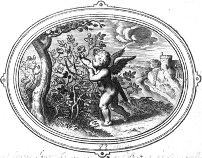 ほら、アモルがバラの木からすてきなバラの花を爪で摘もうとして、