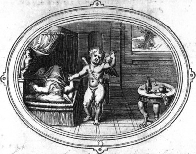 心臓が矢で射られたアモルが、目隠し布(おそらく病鉢巻)を頭に巻いたまま、薄暗い部屋のなかの天蓋付きベッドの上でぐったりと横たわっている。もう一人のアモルがベッドの脇に立ち、このアモルの脈を取り、フラスコに入った尿を検査している。小テーブルには薬瓶や水差しがあり、巻紙には「PX COR」(「心の平安」PAX CORDISの略)と書かれている文字が見える。