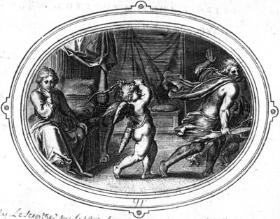 アモルが弓を使って、ユッピテル神をベッドから追い出している。大神は、その強力な武器である雷霆を使わず、それを右手にもったまま素早く逃げていく。そのあわてぶりは、大神の侍者であるワシを大神自らが今にも踏みつけかねないことからわかる。一方、女はほおづえをつきながらベッドの隅に座って憂鬱に考えこんでいる。