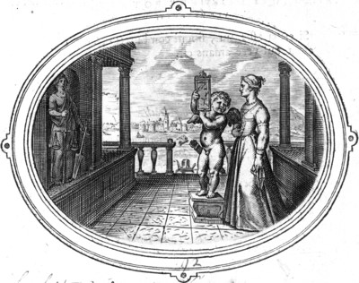 アモルが台の上に立って、女性に向かって鏡を差し出している。その鏡の高さは、ちょうど女性の顔が映る位置にある。女性は左手にハンカチを持ち、右手の手のひらを広げて腹のあたりに当てている。女性の正面の壁のくぼみには、<運の女神>の女神像がある。女神は左手に舟の櫂、右手には天秤をもっている。櫂は<運の女神>の女神がとくに航海と結びつけられていたことによる[➽7番]。天秤は、<時機>の象徴として物事が未決定な状態を示すが、ここでは相手の本性を正確に映し出す「正しさ」の象徴になっている。