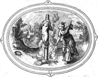 両手を台木に縛られたアモルが火刑を受けている。執行者は女性で、火を盛んに燃やそうとフォークで火種をくべている。